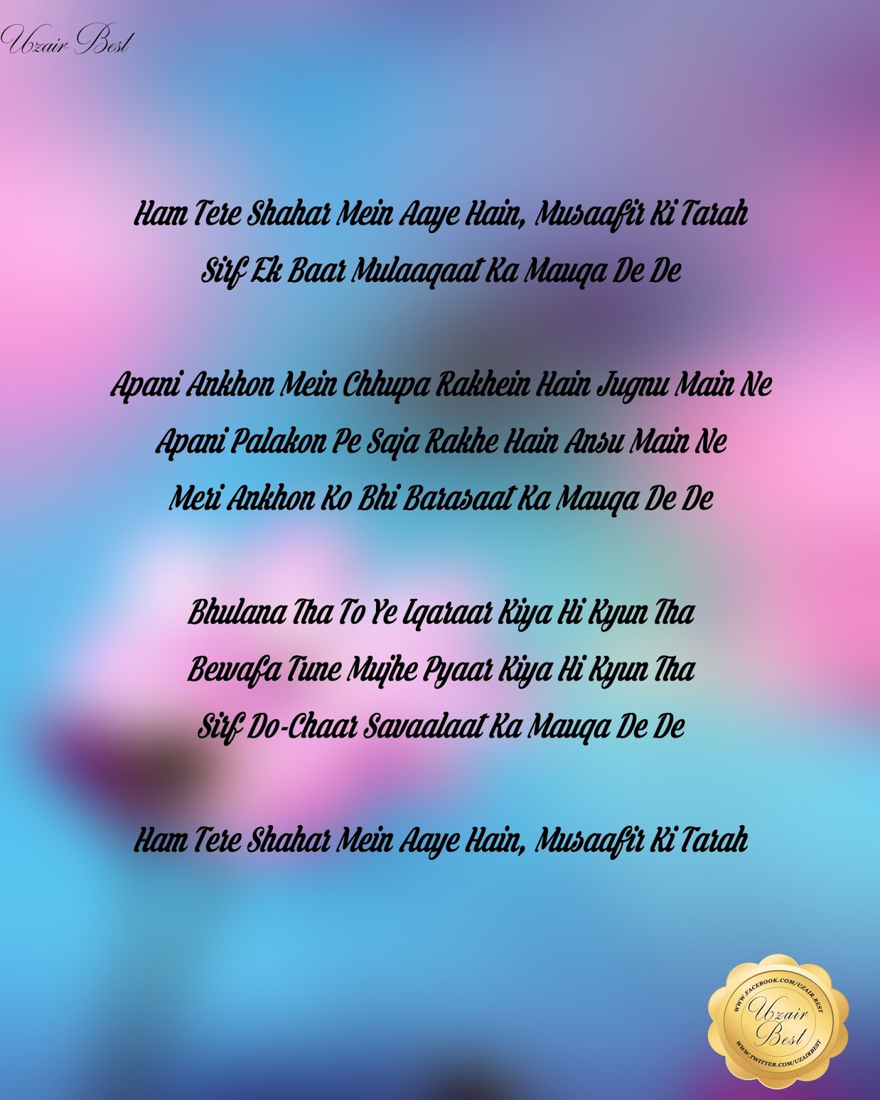 Hum Tere Shahar Me Aaye Hai / .main ne apani ankhon mein chhupa rakhein hain jugnu main ne apani palakon pe saja rakhe hain ansu main ne meri ankhon ko bhi barasaat ka mauqa de de ham tere shahar mein aaye hain, musaafir ki album :